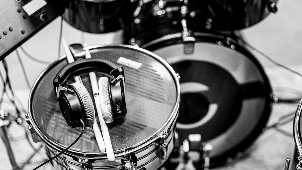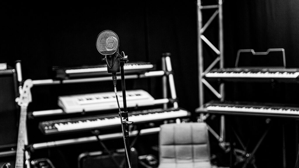 Next to this is an insulated recording room that can be used to record audio and video sources of multiple kinds. From vocals to guitars to keys to drums and everything in between. This studio is equipped to record and mix it. This room houses a robust set of percussion instruments, keyboards and synthesizer units, guitar amps and an electronic mesh head drumkit.