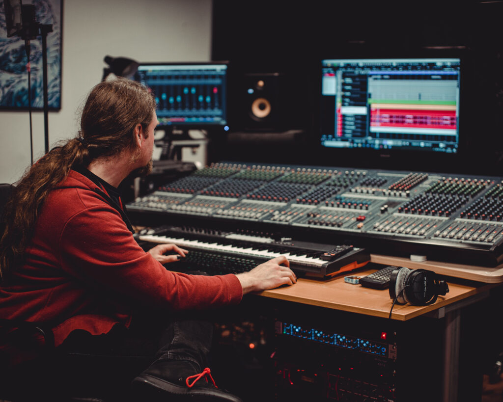 Production work for audio is done in Steinberg’s Cubase Pro software. Video editing and finalizing is done with Adobe Premiere Pro. Website designs are made with the Adobe Suite of software for design purposes. Websites are made with either WordPress or (if required) completely created from the ground up in HTML. This room is also used for recording voiceovers & vocals for diverse projects.