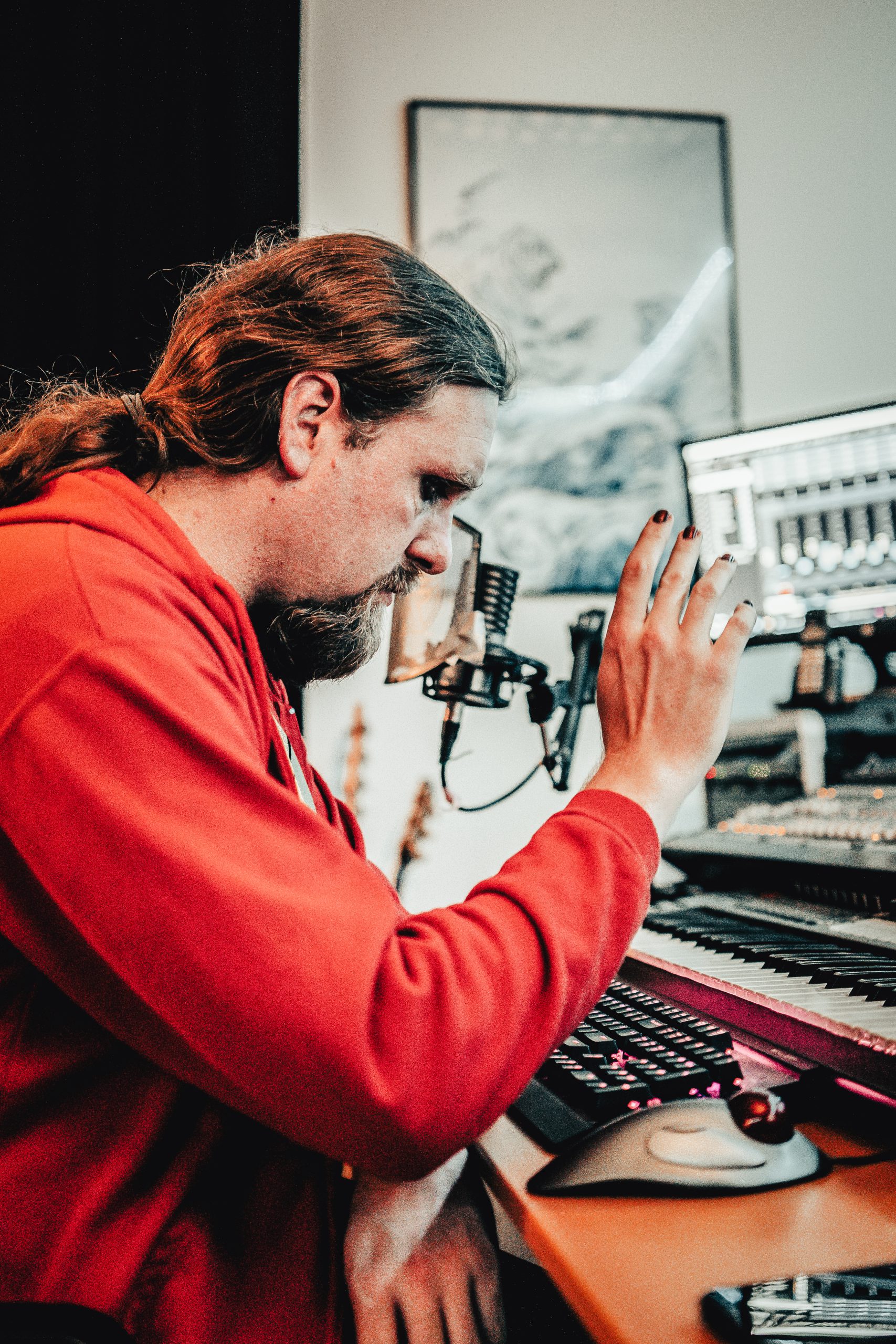 Production work for audio is done in Steinberg’s Cubase Pro software. Video editing and finalizing is done with Adobe Premiere Pro. Website designs are made with the Adobe Suite of software for design purposes. Websites are made with either WordPress or (if required) completely created from the ground up in HTML. This room is also used for recording voiceovers & vocals for diverse projects.