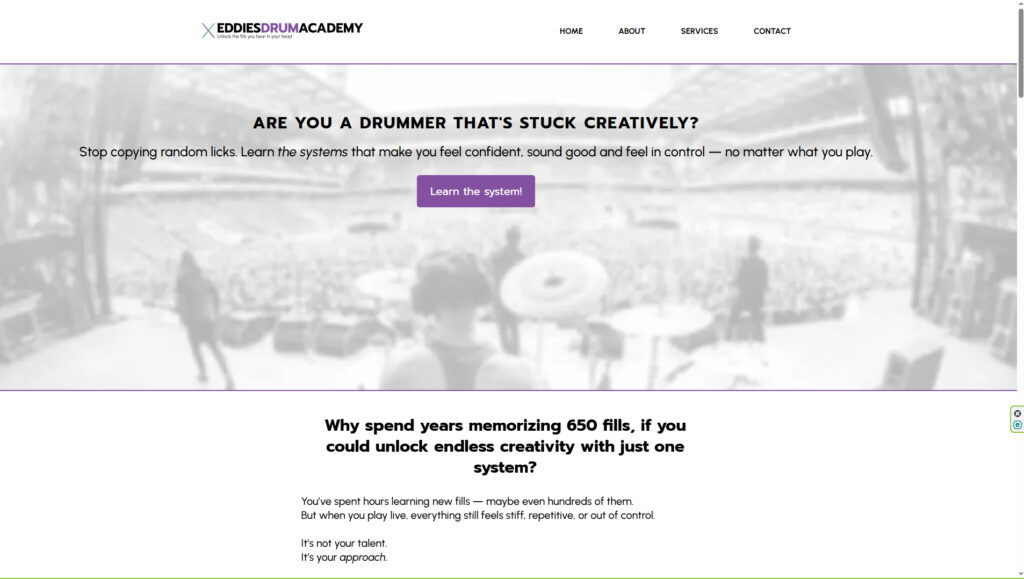 Website based around a professional drummer’s courses and special ebooks that teach drummers to find new grooves and ways of playing to increase their drumming potential. The idea for the site was to be simple yet dynamic and with the right color accents included. I made the logo with the color and fonts based on the clients wishes.