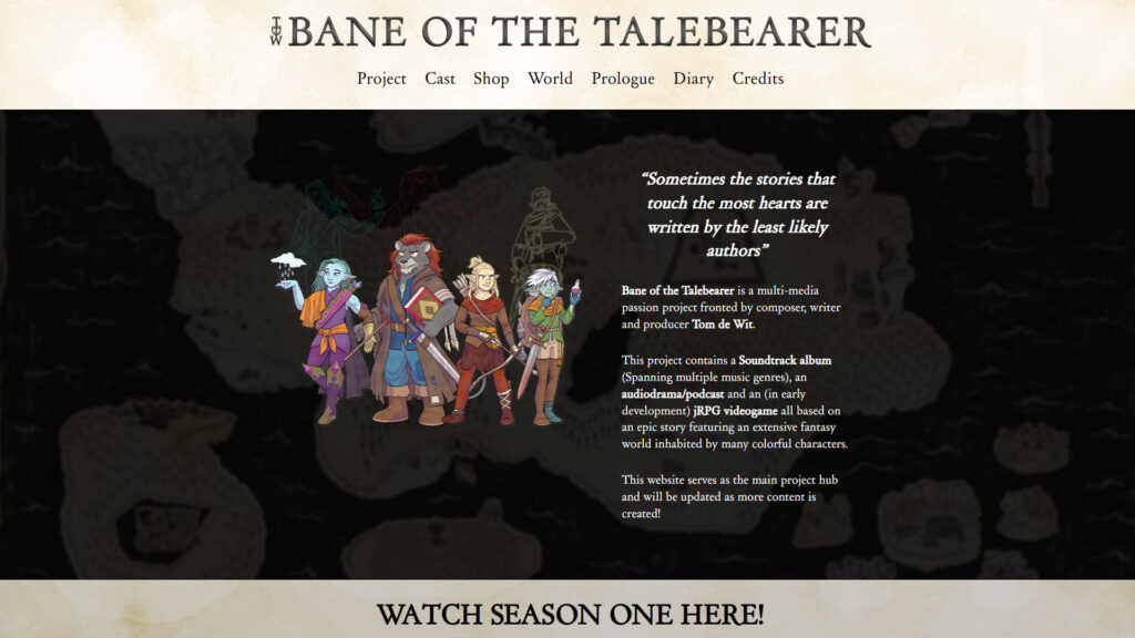 The official website for the multimedia project Bane of the Talebearer that serves both as an information hub, as well as an integral part of that projects’ promotion and worldbuilding. A site that features descriptions of locations, characters and much more, that current and new fans can dive into.